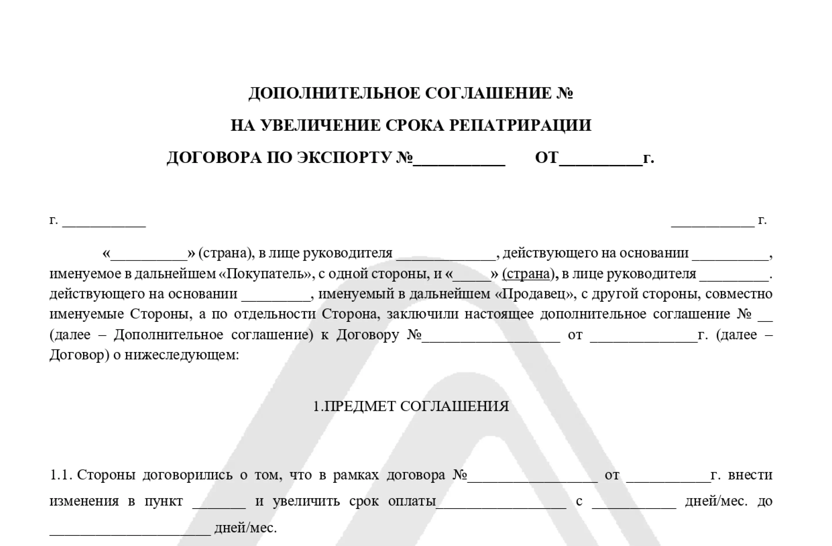 При заключении экспортного договора продавец и покупатель устанавливают сроки, в которые иностранный покупатель должен провести оплату товаров или услуг. Однако некоторые факторы (например, задержка поставок) могут скорректировать планы: покупателю требуется больше времени, чтобы рассчитаться с продавцом. Изменение периода закрепляет дополнительное соглашение (ДС) на увеличение срока репатриации договора по экспорту.