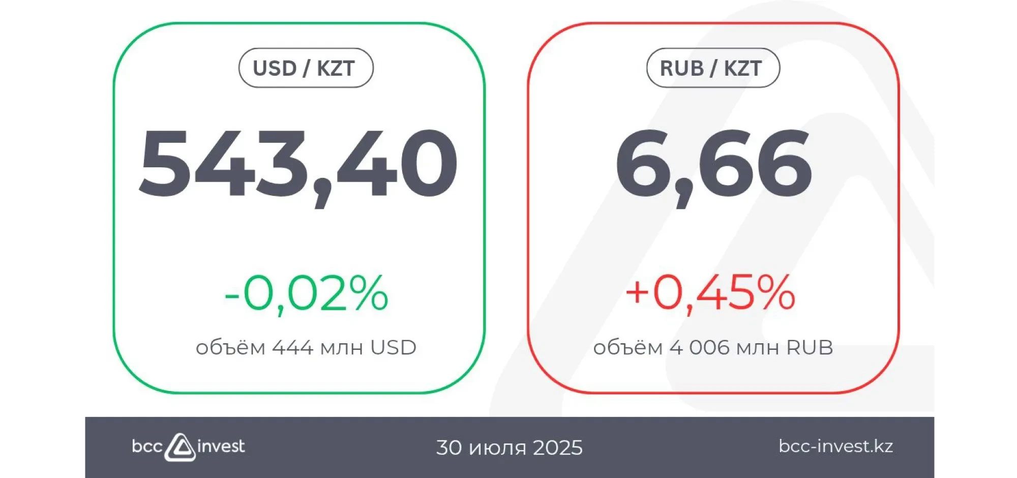 Тенге незначительно укрепился по отношению к доллару США, завершив день на отметке 543,40 (-0,02%). Объём торгов составил 444 млн USD, что указывает на повышенную активность.