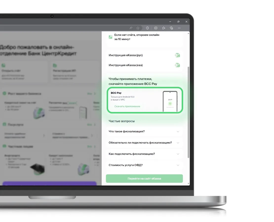 Теперь для фискализации платежей сам аппарат вам не потребуется – приложение bcc pay официально работает с оператором фискальных данных (ОФД) E-Kassa от АО «Казахтелеком». Услуга доступна на Android и iOS.