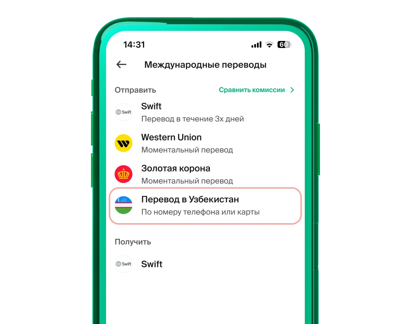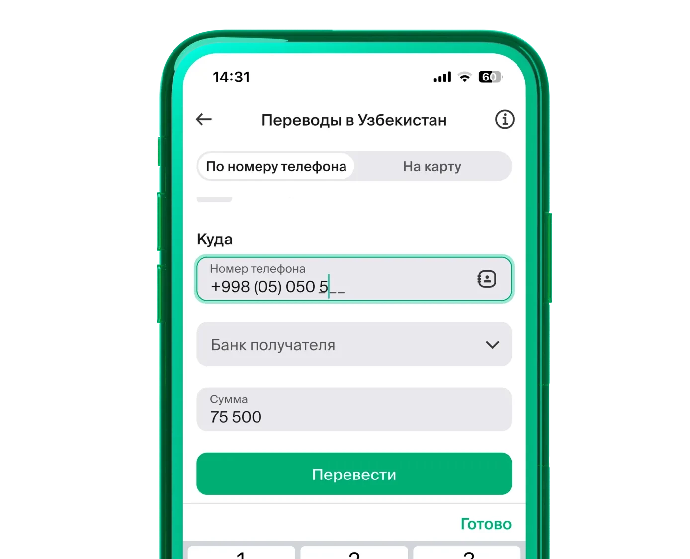 Open bcc.kz app, go to the “Transfers” section, then select “International Transfers” and “Transfers to Uzbekistan”. Choose the transfer method — by phone number or to a card, enter the recipient’s details, and confirm the transfer. The money will reach your recipient instantly.