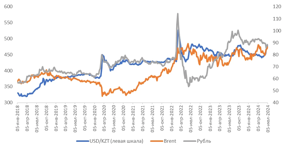 Strengthening of fundamentally weak tenge with negative current account balance did not reflect the equilibrium values of the domestic currency. Sharp depreciation of tenge at falling currency sale volumes from the national funds is a natural factor. Now the exchange rate has reached KZT 480, while for the first time in two years the current account has become positive and is in surplus ($1.8 bn in Q1 2024).