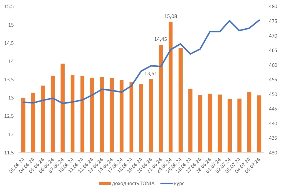 The market forward-looking indicator, which can give further short-term movement of tenge, is the yield on Repo agreements. When the TONIA indicator yield grows, reduction in market liquidity is observed, which is presumably used to purchase either government bonds or foreign currency, resulting in weakening of tenge. This indicator has a short-term effect, and we saw the same thing in late June, when repo yields rose sharply from 13.51% to 15.08% and affected the further weakening of tenge.