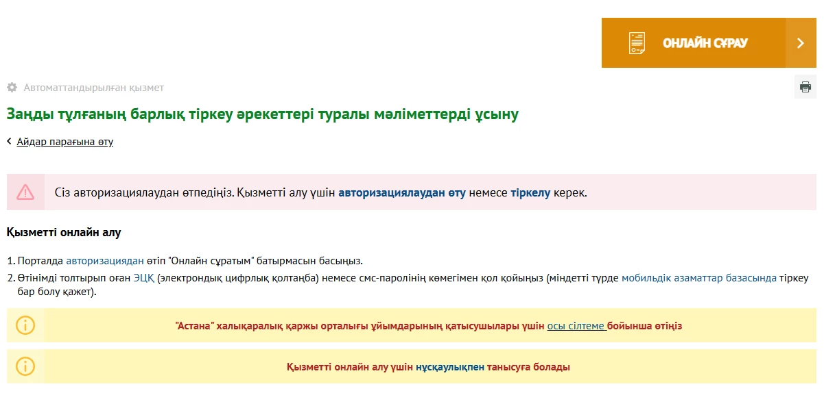ОНЛАЙН СҰРАУ батырмасын басыңыз. Платформада электронды цифрлық қолтаңбаның көмегімен авторизациядан өту қажет, оны қашықтан алуға болады.