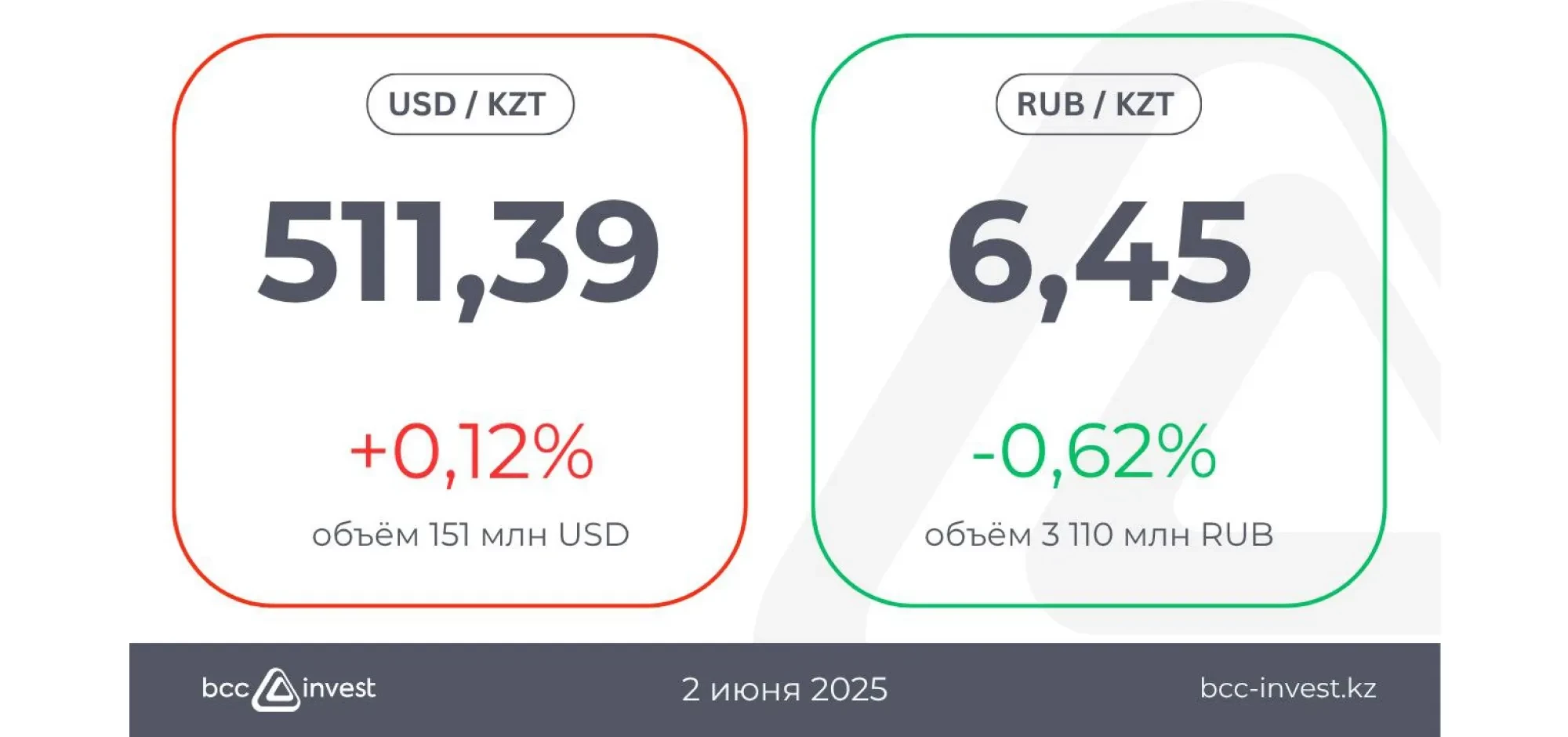 Сонымен қатар, рубльдің теңгеге шаққандағы бағамы 6,45-ке дейін төмендеді (-0,62%), ал сауда көлемі 3 110 млн рубльді құрады.