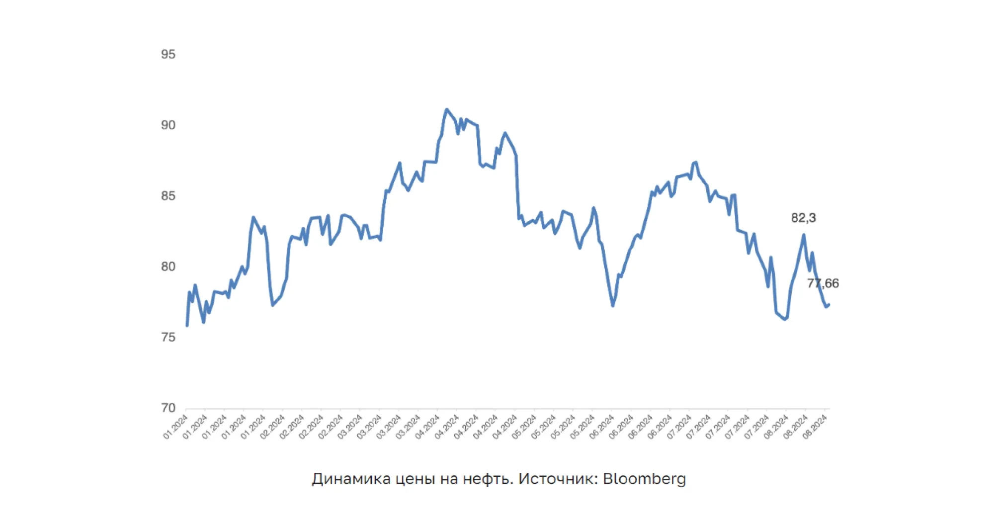 Әлемдік экономиканың баяулауы мен геосаяси шиеленістің әлсіреуі аясында Brent маркалы мұнайдың бағасы $77 дейін төмендеді. Қытайда ішкі тұтыну рекордтық қарқынмен төмендеуде, ал АҚШ-та жұмыссыздық деңгейінің өсуі байқалады. ОПЕК пен ХЭА 2024-2025 жылдарға арналған мұнайға сұраныстың өсуі жөніндегі болжамдарды төмендетеді, бұл да нарыққа қысым көрсетеді. Таяу Шығыстағы геосаяси шиеленістің әлсіреуіне және жоғары базалық мөлшерлемелердің ұзақ кезеңінен туындаған әлемдік тұтынудың баяулауына байланысты мұнай бағасының одан әрі төмендеуі күтілуде. Мұнай бағасы соңғы бес жылда теңге бағамымен әлсіз корреляцияны көрсетсе де, одан әрі төмендеген кезде елдің төлем балансын әлсіретуі мүмкін, бұл өз кезегінде валюта нарығындағы девальвациялық болжамдарды күшейтеді.