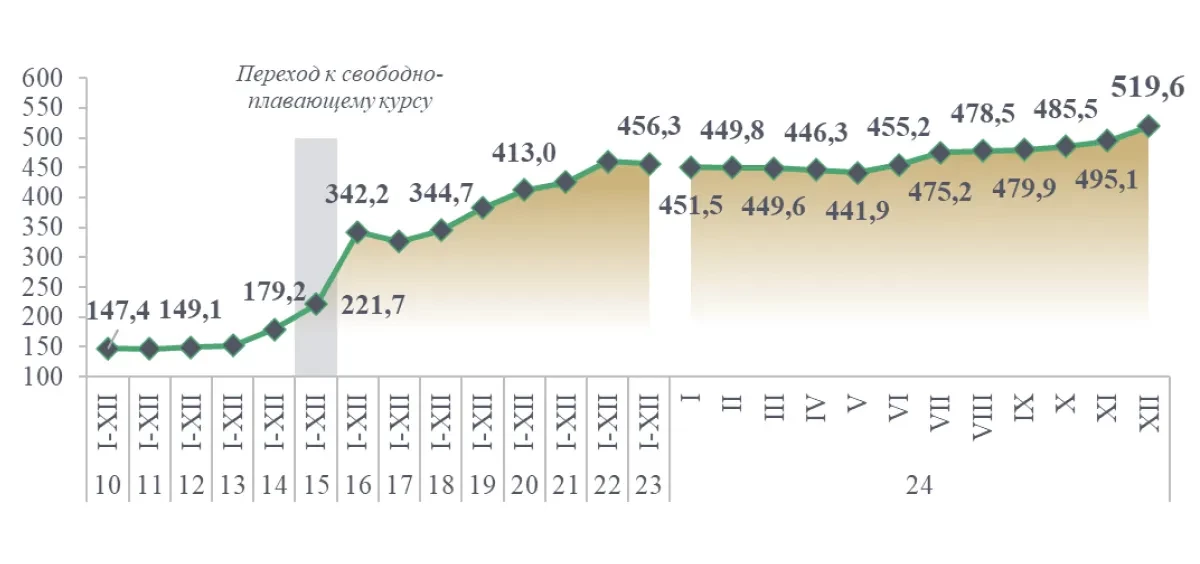 2024 жылға арналған деректер валюта бағамының нығаюын көрсетеді, көрсеткіш екінші тоқсанда 88,7-ге жетіп, үшінші тоқсанда 85,2-ге дейін аздап төмендеді. Бұл мемлекет қаржысы есебінен тікелей немесе жанама түрде қаржыландырылған фискалдық импульспен байланысты. Бағамның нығаю үрдісі елдің бәсекеге қабілеттілік позицияларының жақсарғанын көрсетеді, алайда әрі қарай орнықты нығаю ішкі макроэкономикалық тұрақтылықты қолдауды талап етеді және ҰҚ-тың жиі араласуына себеп болуы мүмкін.