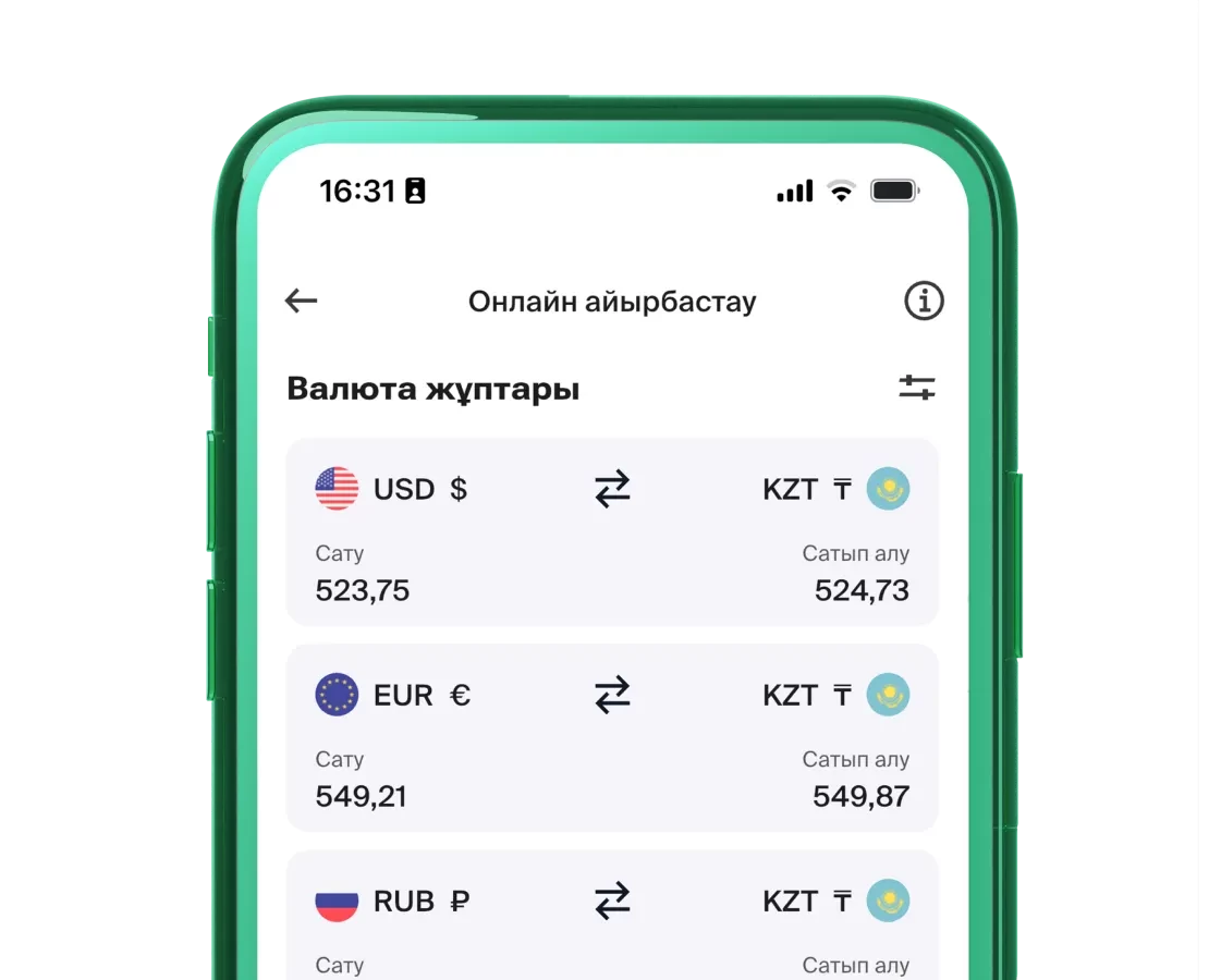[{"currencyPairId":14,"currencySell":"USD","currencyBuy":"KZT","currencyMain":"USD","currencyMinor":"KZT","currencyName":"\u0410\u049a\u0428 \u0434\u043e\u043b\u043b\u0430\u0440\u044b","pictureUrlMain":"api\/v1\/fx\/images\/flags\/usd.png","pictureUrlMinor":"api\/v1\/fx\/images\/flags\/kzt.png","sell":510.34,"buy":511.96,"lastUpdateDateTime":"10.01.2026 07:52:12","currencyMainName":"USD","currencyMinorName":"KZT","stopTomLossSell":576.51,"stopTomLossBuy":445.67,"stopSpotLossSell":576.57,"stopSpotLossBuy":445.75,"maxAmount":1000000,"minAmount":1,"ricRound":2,"amountRound":2,"functionalType":"ON_THR","currencyMainSymbol":"$","currencyMinorSymbol":"\u20b8","sellNet":510.34,"buyNet":511.96,"orderQtyRound":2,"quoteOriginalNetRound":2,"isAvailable24x5":null,"isAvailableUntil":null,"availableUntilTime":null},{"currencyPairId":15,"currencySell":"EUR","currencyBuy":"KZT","currencyMain":"EUR","currencyMinor":"KZT","currencyName":"\u0415\u0443\u0440\u043e","pictureUrlMain":"api\/v1\/fx\/images\/flags\/eur.png","pictureUrlMinor":"api\/v1\/fx\/images\/flags\/kzt.png","sell":593.06,"buy":596.58,"lastUpdateDateTime":"10.01.2026 07:52:12","currencyMainName":"EUR","currencyMinorName":"KZT","stopTomLossSell":670.1,"stopTomLossBuy":519.24,"stopSpotLossSell":670.21,"stopSpotLossBuy":519.33,"maxAmount":900000,"minAmount":1,"ricRound":2,"amountRound":2,"functionalType":"ON_THR","currencyMainSymbol":"\u20ac","currencyMinorSymbol":"\u20b8","sellNet":593.06,"buyNet":596.58,"orderQtyRound":2,"quoteOriginalNetRound":2,"isAvailable24x5":null,"isAvailableUntil":null,"availableUntilTime":null},{"currencyPairId":16,"currencySell":"RUB","currencyBuy":"KZT","currencyMain":"RUB","currencyMinor":"KZT","currencyName":"\u0420\u0443\u0431\u043b\u044c","pictureUrlMain":"api\/v1\/fx\/images\/flags\/rub.png","pictureUrlMinor":"api\/v1\/fx\/images\/flags\/kzt.png","sell":6.4224,"buy":6.5232,"lastUpdateDateTime":"10.01.2026 07:52:12","currencyMainName":"RUB","currencyMinorName":"KZT","stopTomLossSell":7.2336,"stopTomLossBuy":5.6978,"stopSpotLossSell":7.2325,"stopSpotLossBuy":5.6987,"maxAmount":80000000,"minAmount":1,"ricRound":4,"amountRound":2,"functionalType":"ON_THR","currencyMainSymbol":"\u20bd","currencyMinorSymbol":"\u20b8","sellNet":6.4224,"buyNet":6.5232,"orderQtyRound":2,"quoteOriginalNetRound":4,"isAvailable24x5":null,"isAvailableUntil":null,"availableUntilTime":null},{"currencyPairId":17,"currencySell":"GBP","currencyBuy":"KZT","currencyMain":"GBP","currencyMinor":"KZT","currencyName":"\u0424\u0443\u043d\u0442 \u0441\u0442\u0435\u0440\u043b\u0438\u043d\u0433\u0456","pictureUrlMain":"api\/v1\/fx\/images\/flags\/gbp.png","pictureUrlMinor":"api\/v1\/fx\/images\/flags\/kzt.png","sell":684.37,"buy":686.51,"lastUpdateDateTime":"10.01.2026 07:52:12","currencyMainName":"GBP","currencyMinorName":"KZT","stopTomLossSell":773.28,"stopTomLossBuy":597.48,"stopSpotLossSell":773.39,"stopSpotLossBuy":597.57,"maxAmount":700000,"minAmount":1,"ricRound":2,"amountRound":2,"functionalType":"ON_THR","currencyMainSymbol":"\u00a3","currencyMinorSymbol":"\u20b8","sellNet":684.37,"buyNet":686.51,"orderQtyRound":2,"quoteOriginalNetRound":2,"isAvailable24x5":null,"isAvailableUntil":null,"availableUntilTime":null},{"currencyPairId":18,"currencySell":"EUR","currencyBuy":"USD","currencyMain":"EUR","currencyMinor":"USD","currencyName":"\u0415\u0443\u0440\u043e","pictureUrlMain":"api\/v1\/fx\/images\/flags\/eur.png","pictureUrlMinor":"api\/v1\/fx\/images\/flags\/usd.png","sell":1.16301,"buy":1.16436,"lastUpdateDateTime":"10.01.2026 07:52:12","currencyMainName":"EUR","currencyMinorName":"USD","stopTomLossSell":null,"stopTomLossBuy":null,"stopSpotLossSell":null,"stopSpotLossBuy":null,"maxAmount":900000,"minAmount":1,"ricRound":5,"amountRound":2,"functionalType":"ON_THR","currencyMainSymbol":"\u20ac","currencyMinorSymbol":"$","sellNet":1.16301,"buyNet":1.16436,"orderQtyRound":2,"quoteOriginalNetRound":5,"isAvailable24x5":null,"isAvailableUntil":null,"availableUntilTime":null},{"currencyPairId":19,"currencySell":"USD","currencyBuy":"RUB","currencyMain":"USD","currencyMinor":"RUB","currencyName":"\u0410\u049a\u0428 \u0434\u043e\u043b\u043b\u0430\u0440\u044b","pictureUrlMain":"api\/v1\/fx\/images\/flags\/usd.png","pictureUrlMinor":"api\/v1\/fx\/images\/flags\/rub.png","sell":78.5,"buy":79.5,"lastUpdateDateTime":"10.01.2026 07:52:12","currencyMainName":"USD","currencyMinorName":"RUB","stopTomLossSell":null,"stopTomLossBuy":null,"stopSpotLossSell":null,"stopSpotLossBuy":null,"maxAmount":1000000,"minAmount":1,"ricRound":4,"amountRound":2,"functionalType":"ON_THR","currencyMainSymbol":"$","currencyMinorSymbol":"\u20bd","sellNet":78.5,"buyNet":79.5,"orderQtyRound":2,"quoteOriginalNetRound":4,"isAvailable24x5":null,"isAvailableUntil":null,"availableUntilTime":null},{"currencyPairId":20,"currencySell":"GBP","currencyBuy":"USD","currencyMain":"GBP","currencyMinor":"USD","currencyName":"\u0424\u0443\u043d\u0442 \u0441\u0442\u0435\u0440\u043b\u0438\u043d\u0433\u0456","pictureUrlMain":"api\/v1\/fx\/images\/flags\/gbp.png","pictureUrlMinor":"api\/v1\/fx\/images\/flags\/usd.png","sell":1.34026,"buy":1.34168,"lastUpdateDateTime":"10.01.2026 07:52:12","currencyMainName":"GBP","currencyMinorName":"USD","stopTomLossSell":null,"stopTomLossBuy":null,"stopSpotLossSell":null,"stopSpotLossBuy":null,"maxAmount":700000,"minAmount":1,"ricRound":5,"amountRound":2,"functionalType":"ON_THR","currencyMainSymbol":"\u00a3","currencyMinorSymbol":"$","sellNet":1.34026,"buyNet":1.34168,"orderQtyRound":2,"quoteOriginalNetRound":5,"isAvailable24x5":null,"isAvailableUntil":null,"availableUntilTime":null},{"currencyPairId":21,"currencySell":"XAU","currencyBuy":"KZT","currencyMain":"XAU","currencyMinor":"KZT","currencyName":"\u0410\u043b\u0442\u044b\u043d","pictureUrlMain":"api\/v1\/fx\/images\/flags\/xau.png","pictureUrlMinor":"api\/v1\/fx\/images\/flags\/kzt.png","sell":73679.19,"buy":74144.01,"lastUpdateDateTime":"10.01.2026 07:52:12","currencyMainName":"GOLD","currencyMinorName":"KZT","stopTo