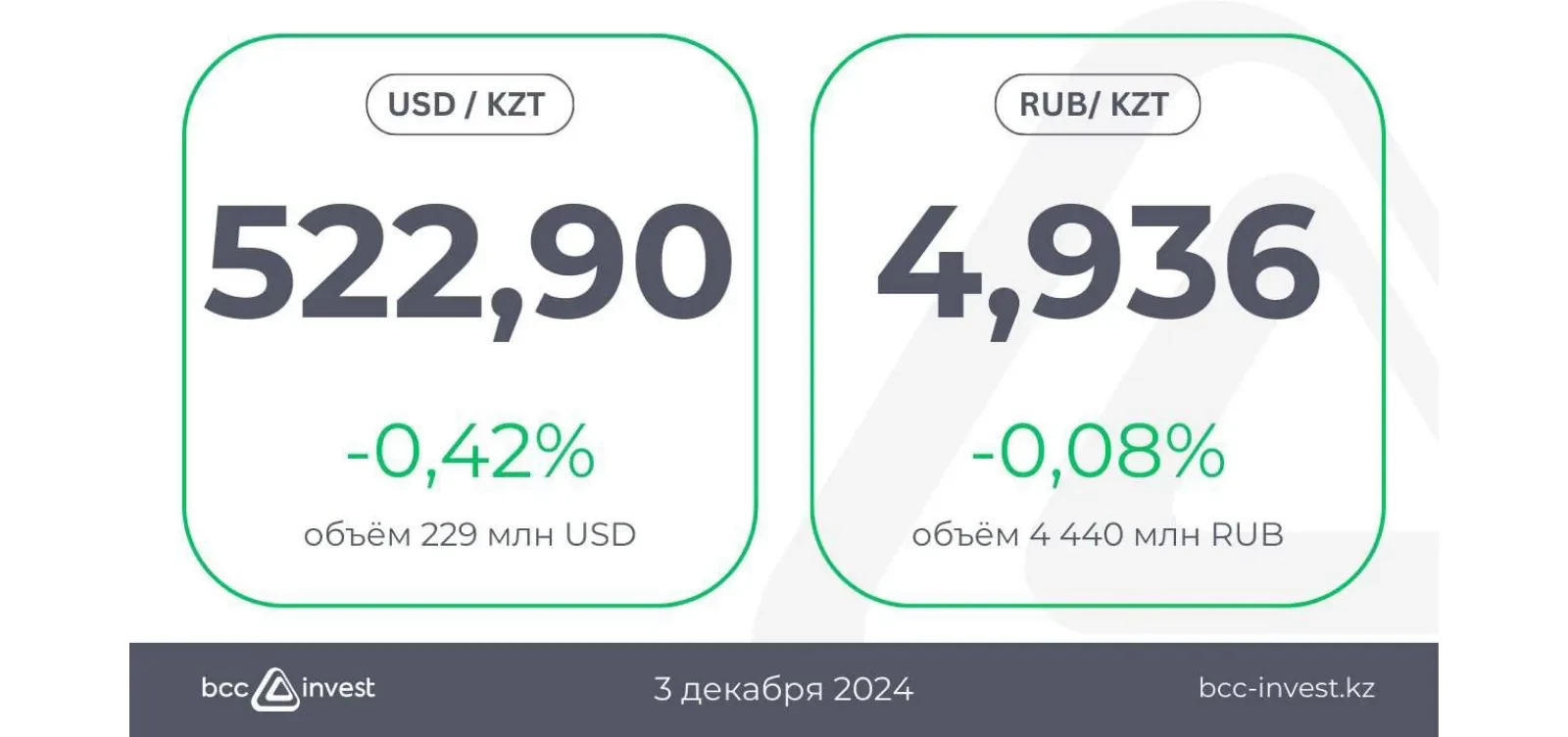 Курс тенге на момент закрытия торгов продемонстрировал небольшое укрепление на средних объемах. Аналитики BCC Invest ожидают относительное снижение волатильности национальной валюты.