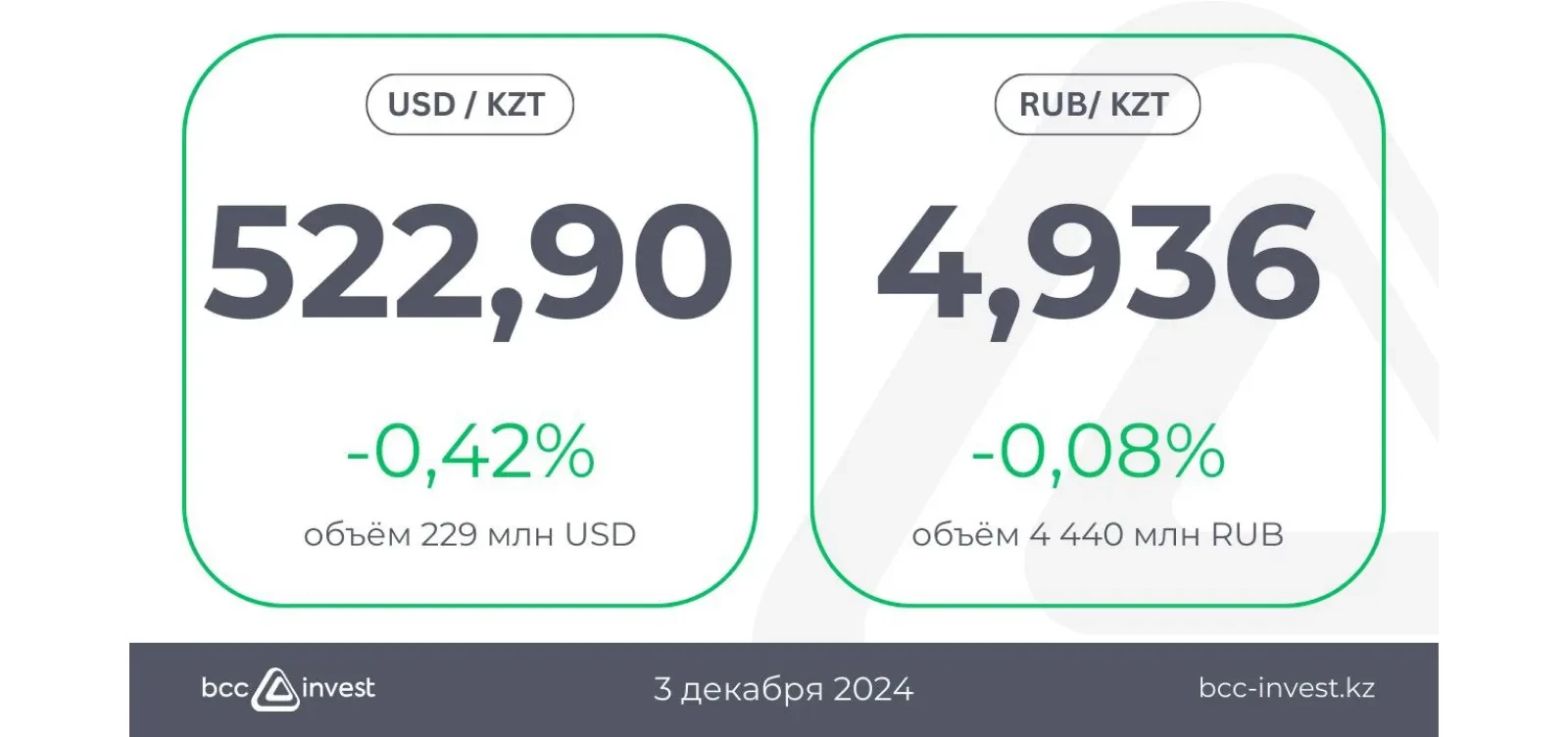 Курс тенге на момент закрытия валютных торгов 3 декабря продемонстрировал небольшое укрепление (-0,42%) на средних объемах (229 млн $) и сложился на уровне 522,9 тенге.