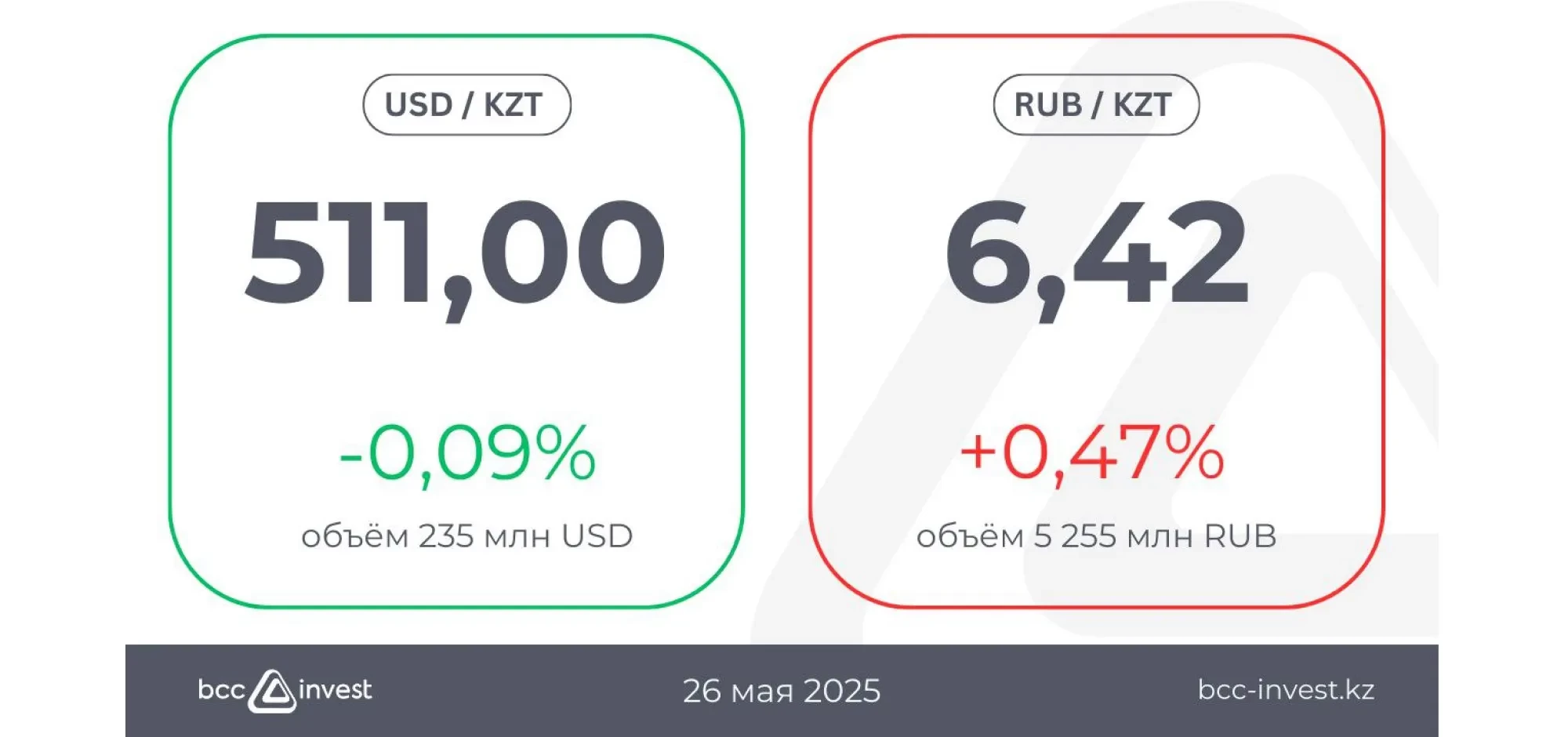 Курс тенге немного укрепился на 0,09%, составив 511 тенге за доллар. Объёмы средние - 235 млн USD.