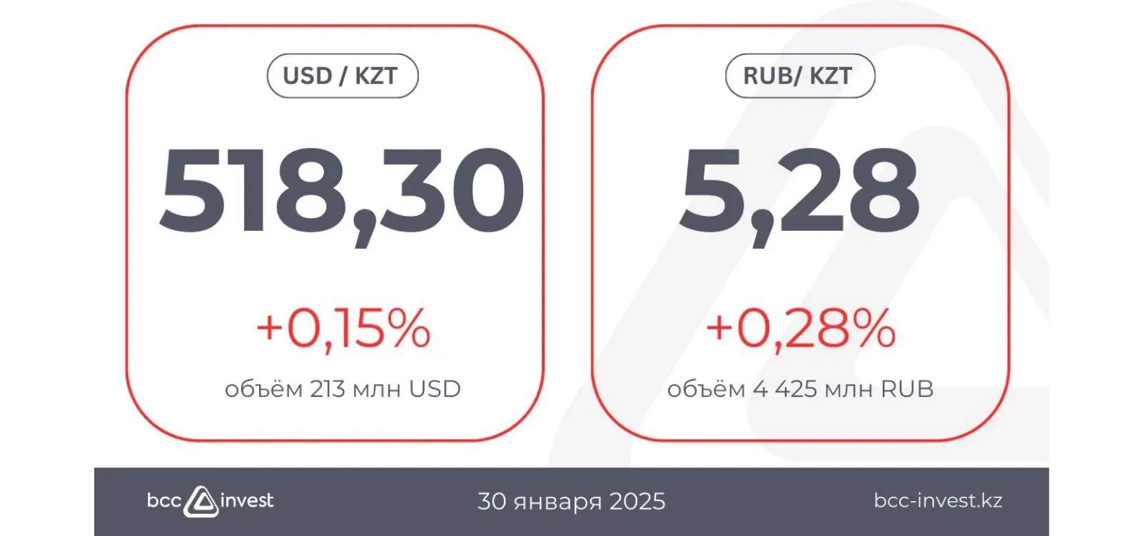 Курс тенге к доллару завершил день на уровне 518,30, показав незначительное ослабление. Торговая активность оставалась стабильной, объём сделок составил 213 млн USD.