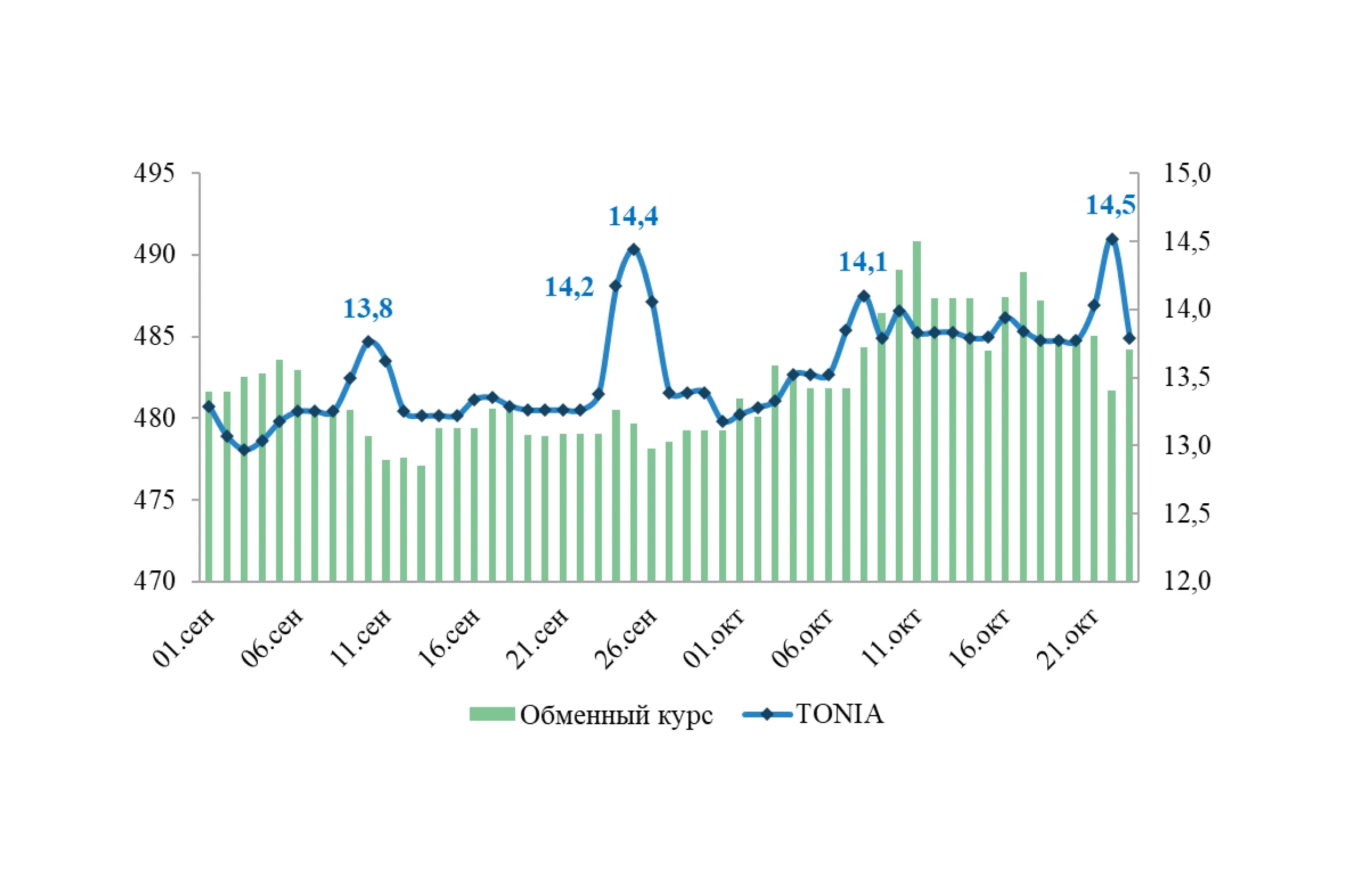 По последним неполным данным среднемесячный обменный курс за октябрь 2024 года составил 485 тенге, тем самым курс сначала года обесценился на 5,9% или на 27,2 тенге. С начала сентября наблюдается постепенное обесценение национальной валюты, достигнув 11 октября 2024 года своего пикового значения в 490,8 тенге за 1 доллар США.