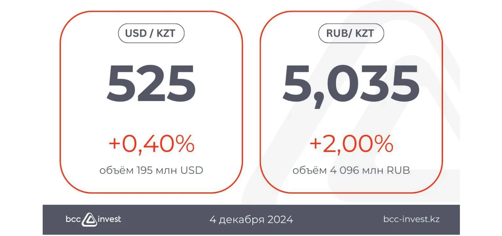 Курс тенге на момент закрытия валютных торгов 4 декабря продемонстрировал снижение на 0,40% при объеме торгов 195 млн USD и сложился на уровне 525 тенге за доллар.
