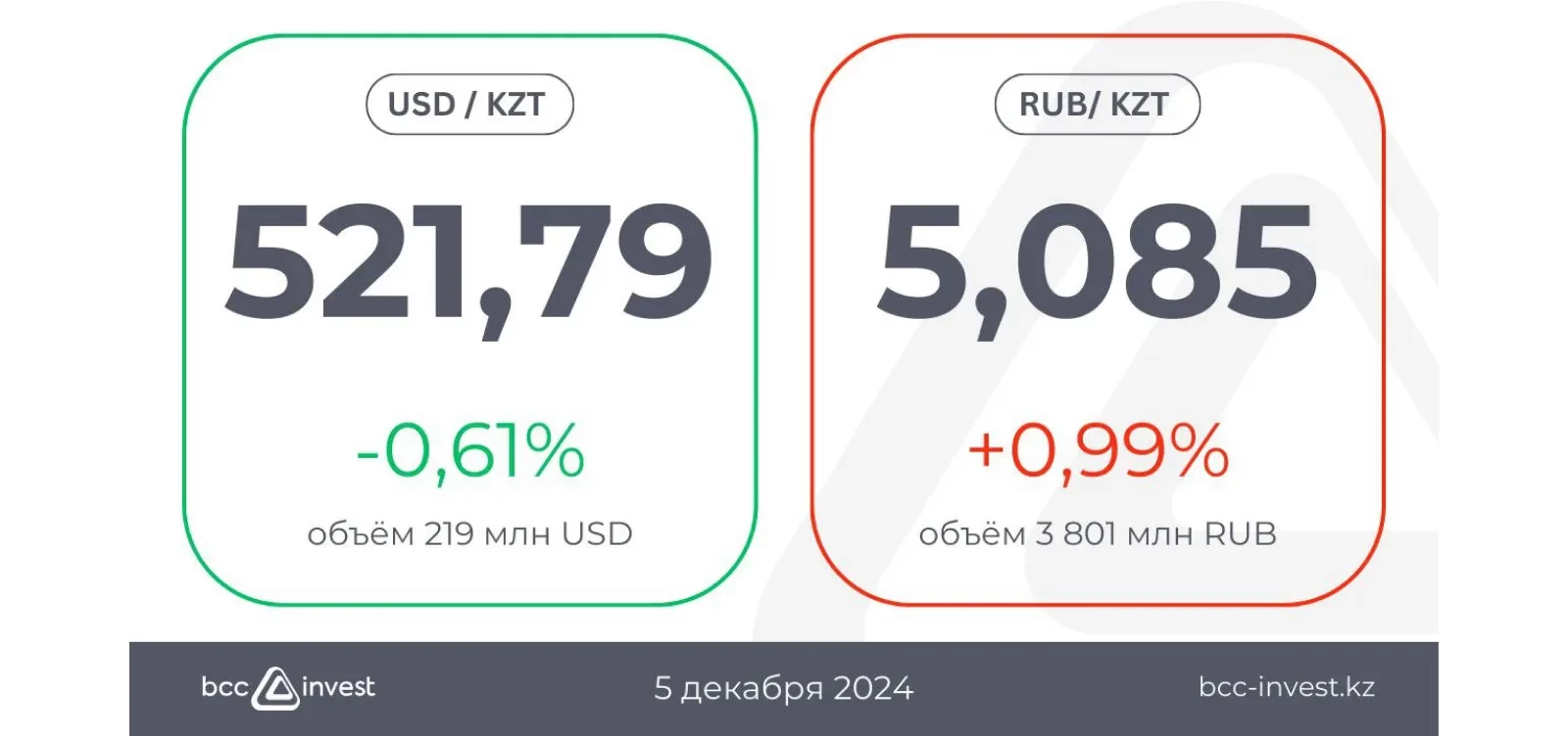 Курс тенге на момент закрытия валютных торгов 5 декабря укрепился на 0,61% при объеме торгов 219 млн USD и составил 521,79 тенге за доллар.