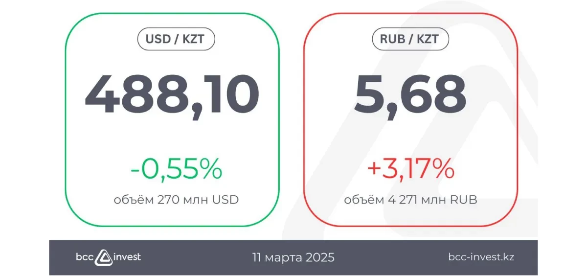 Рубль, напротив, вырос на 3,17% до 5,68 тенге при объёме 4 271 млн.
