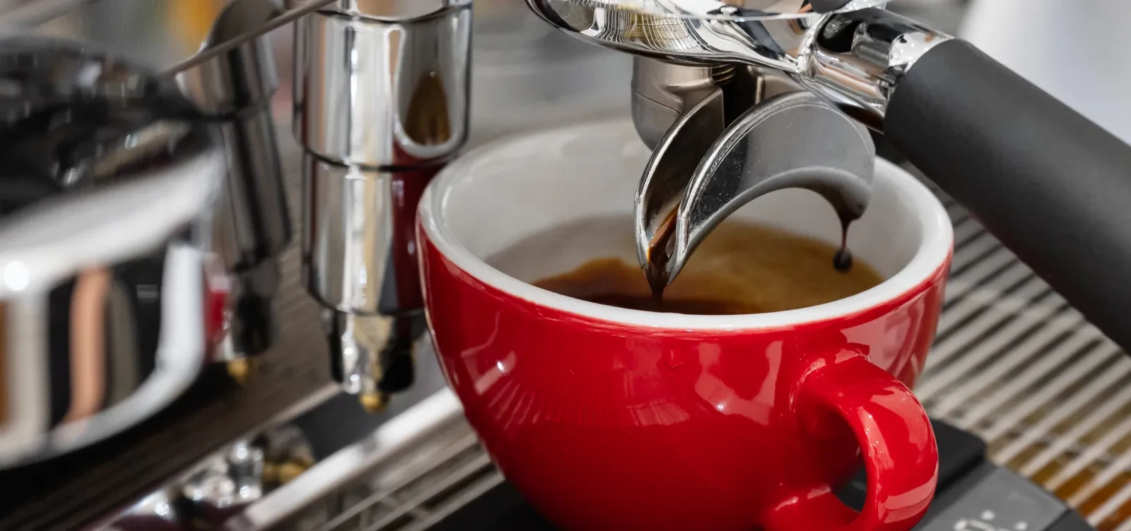 A coffee machine brews espresso — the base for most coffee drinks like latte, cappuccino, and flat white.