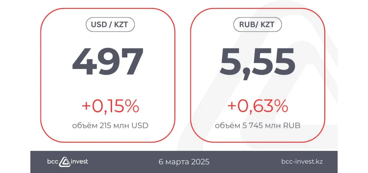 Несмотря на продолжающееся снижение индекса доллара (DXY) до 104,1, курс тенге незначительно ослаб на 0,15%, достигнув отметки 497 тенге за доллар США при объёме торгов 215 млн USD.