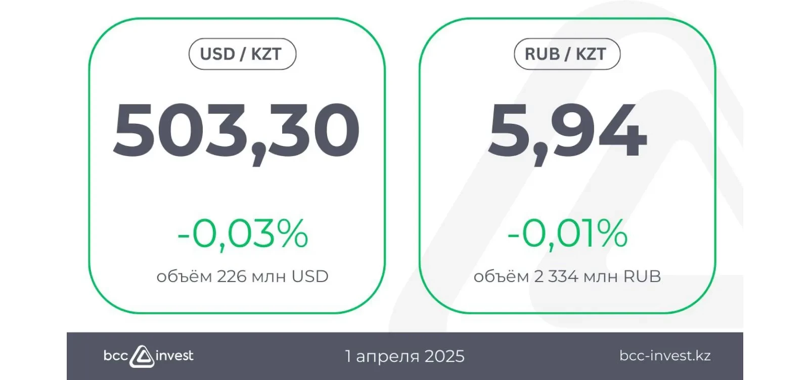 Бірінші тоқсанның қорытындысы бойынша долларға шаққандағы бағам жыл басымен салыстырғанда 21,81 теңгеге немесе 4,2% - ға нығайды (анықтама: ҚРҰБ деректері бойынша 2025 жылғы 1 қаңтарда бағам 1 АҚШ доллары үшін 525,11 теңге болды).