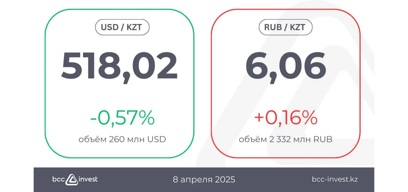 Сауда-саттық қорытындысы бойынша теңге бағамы 518,02 теңгені (-0,57%), ал рубль бағамы — 6,06 теңгені (+0,16%) құрады.