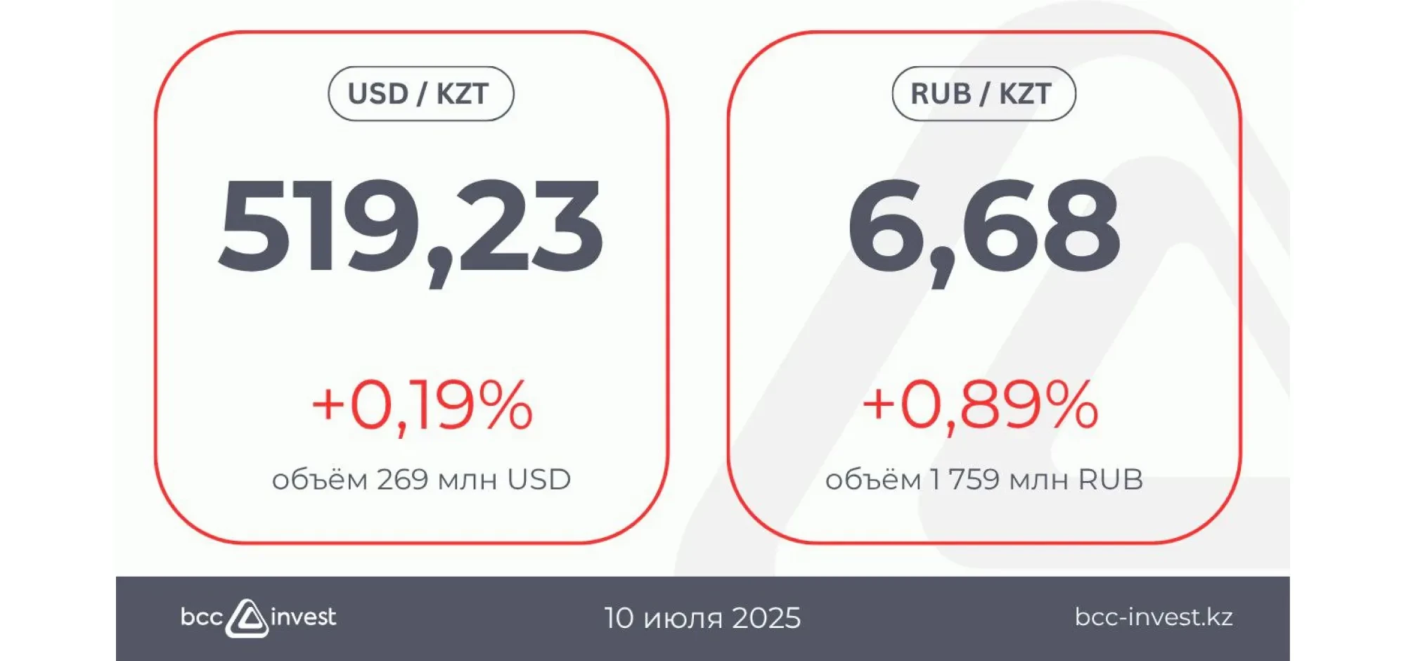 Бүгінгі сауданың нәтижесінде теңге әлсіреуін көрсетті: доллардың курсы 519,23 теңгеге дейін көтеріліп, +0,19%-ға өсті, ал рубль 6,68 теңгеге дейін көтерілді.