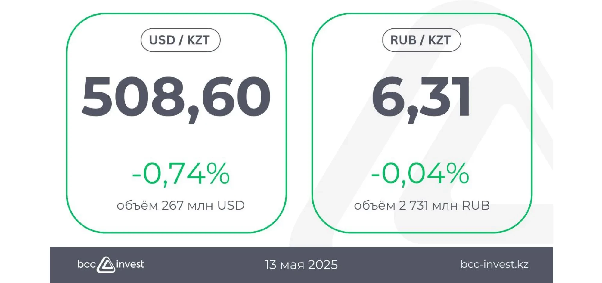 Теңге бағамы нығайып, бір доллар үшін 508,60 теңгеге жетті (−0,74%). Сауда көлемі 267 млн АҚШ долларын құрады. Мамыр айындағы нығаю біздің болжамымызға сәйкес жүзеге асып отыр.