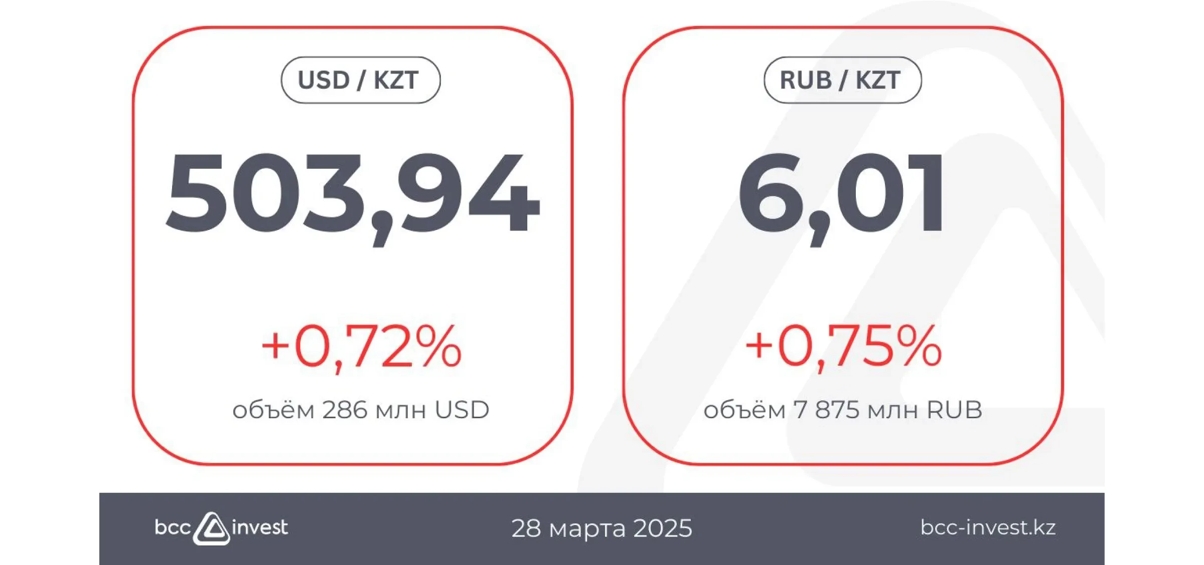 Теңге аздап әлсіреді, сессияны 1 АҚШ доллары үшін 503,94 деңгейінде аяқтады. Сауда белсенділігі тұрақты деңгейде қалды, мәмілелер көлемі 286 млн USD құрады. Ал рубль нығаю үрдісін жалғастырып, 6 теңгеден жоғары саудалануда.