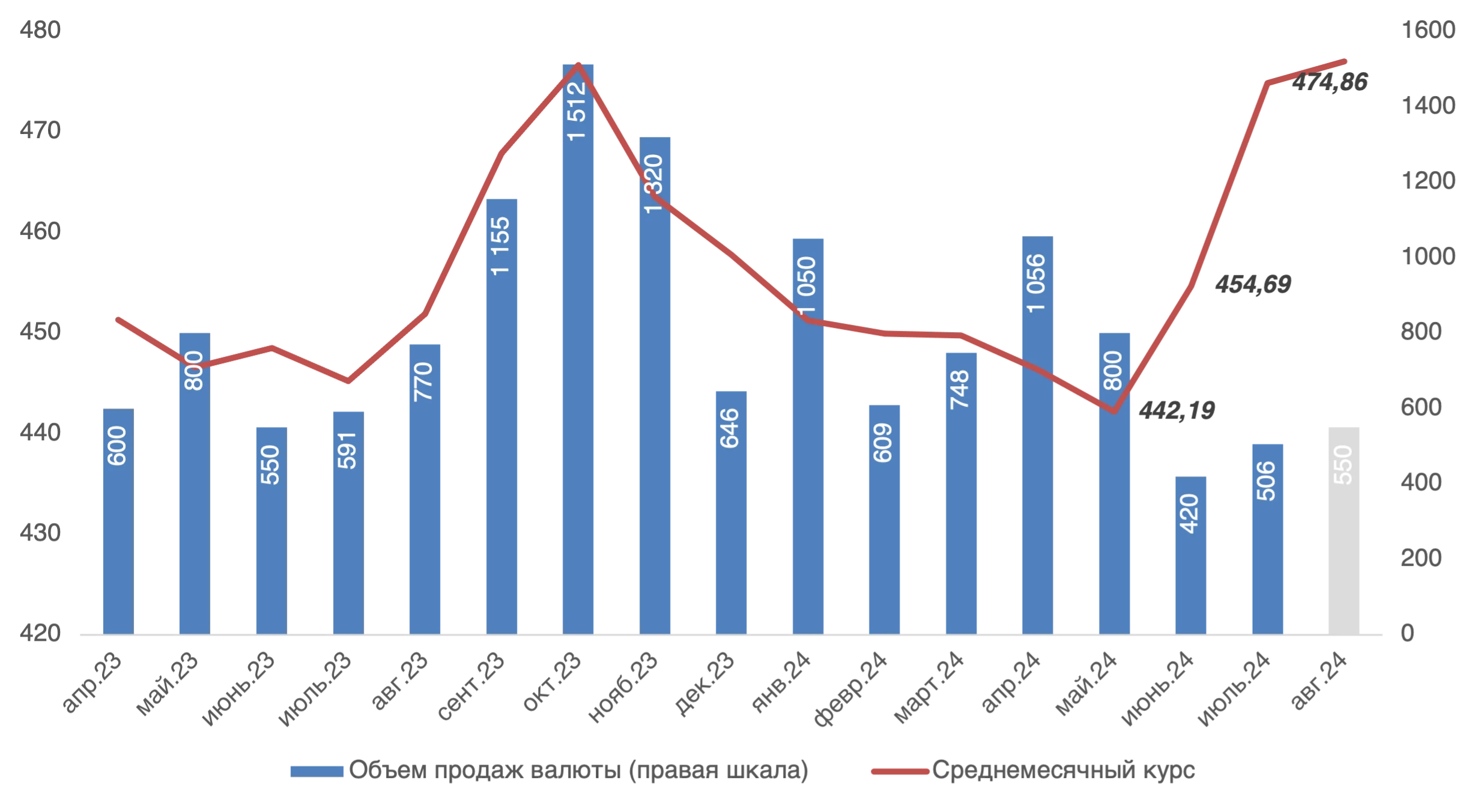 Третий квартал для тенге начался с некоторой стабилизацией курса после заметного ослабления в июне. В результате средний курс тенге по итогам июля ослаб на 6,07% на фоне снижения операции Нацфонда по объему продаж валюты. По итогам июля продажи валюты из Нацфонда для обеспечения трансфертов в республиканский бюджет составили 506 млн долларов и около 984 млн в рамках продажи валюты для приобретения акции Казатомпрома. В августе, согласно прогнозным заявкам Правительства, Нацфонд продаст валюту на аналогичных уровнях 500-600 млн. Эти операции, на наш взгляд, поддерживают курс от чрезмерного ослабления. Как мы уже отмечали ранее, уровень 480 тенге за доллар является привлекательным для участников рынка для продажи американской валюты.